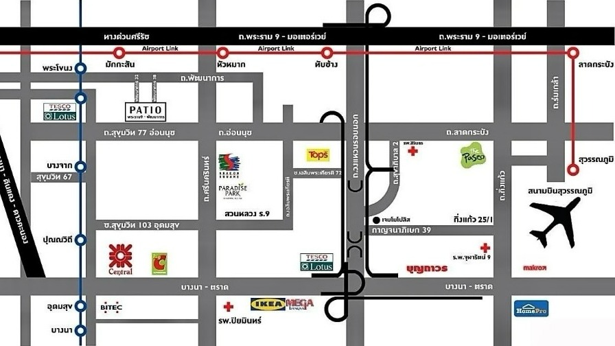 - ใกล้โรงพยาบาลสมิติเวชศรีนครินทร์, โรงพยาบาลพระรามเก้า, โรงพยาบาลกรุงเทพ และ โรงพยาบาลปิยะเวท