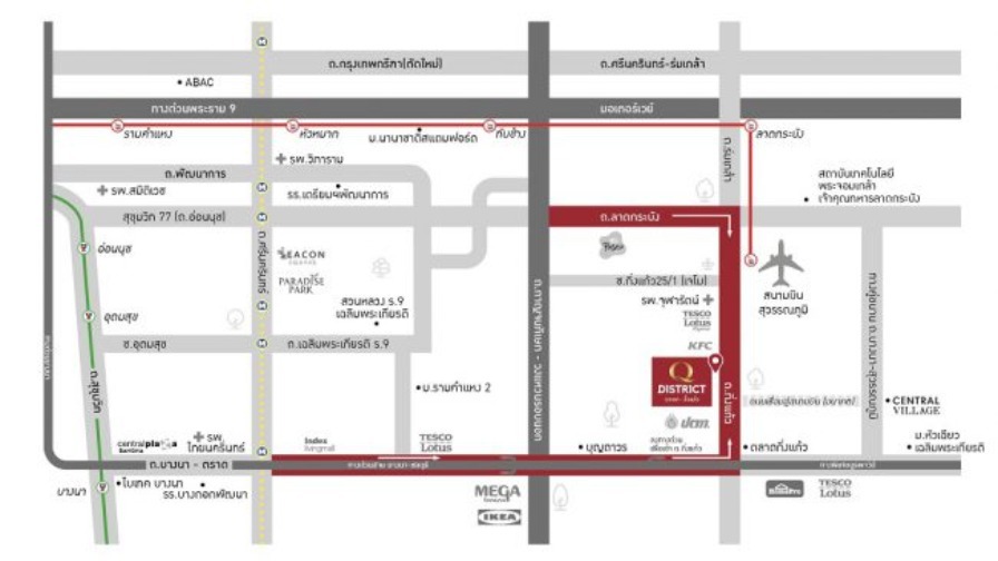 - ใกล้ห้างสรรพสินค้าเมกาบางนา, เซ็นทรัล วิลเลจ, มาร์เก็ต วิลเลจ สุวรรณภูมิ, โรบินสัน ลาดกระบัง, เดอะพาซิโอมอลล์ ลาดกระบัง
